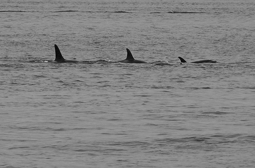 Présence exceptionnelle de 3 Orques ce jeudi 14/04/2011. 8h45, Un « objet » qui semble émerger lentement de l’eau attire mon attention. Je trouve assez rapidement un aileron aux jumelles, puis au téléscope. J’annonce donc à mes 2 comparses « Mammifère type Dauphin » nous avons l’habitude de voir quotidiennement des marsouins, il s’agit plutot ici de Lagénorhynques ou Dauphins de notre point de vue partagé, espèces que nous « connaissons » pour les avoir déjà vues mais très rarement, nos compétences en mammifères marins non communs sont médiocres du fait notamment de la rareté de ces espèces sur le spot. La distance d’observation peut être estimée à environ 1000 mètres mais les distances et tailles sont des éléments toujours subjectifs, il y a 2 individus assez semblables, 1 troisième n’est vu qu’à 3 reprises. Les 3 individus se déplacent très lentement vers l’Est en se présentant à plusieurs reprises de 3/4 face.