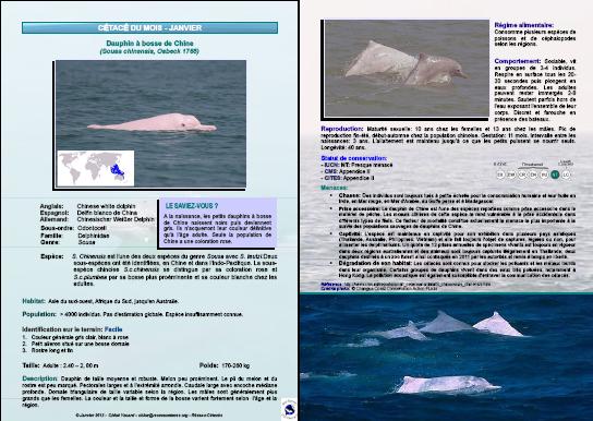 Espèce : S. Chinensisest l’une des deux espèces du genre Sousaavec S. teutzi. Deux sous-espèces ont été identifiées, en Chine et dans l’Indo-Pacifique. La sous-espèce chinoise S.c.chinensisse distingue par sa coloration rose et S.c.plumbeapar sa bosse plus proéminente et sa couleur blanche chez les adultes.
